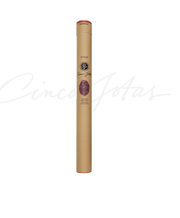 Αυτό το νόστιμο Cinco Jotas 100% ιβηρικό salchichón με βελανίδι είναι φτιαγμένο από άπαχο και κόντρα φιλέτο από το ίδιο προφίλ με το χαμον. Ακολουθείται η συνήθης παραδοσιακή μέθοδος της περιοχής Jabugo, η οποία περιλαμβάνει επίσης τη χρήση χειροκίνητης κοπής μαχαιριού. Η φυσική επούλωση αυτού του κομματιού είναι μεταξύ 4 και 6 μηνών. Η αδιαμφισβήτητη γεύση του 100% Iberian salchichón με βελανίδι Cinco Jotas επιτυγχάνεται χάρη στον συνδυασμό διαφορετικών μπαχαρικών, τα οποία αναμειγνύονται με το κρέας και του δίνουν ένα εξαιρετικό άρωμα. Το μαύρο πιπέρι, το λευκό πιπέρι, το μοσχοκάρυδο και η σωστή πινελιά αλατιού δίνουν στο Cinco Jotas salchichón την αυθεντική και μοναδική του γεύση.