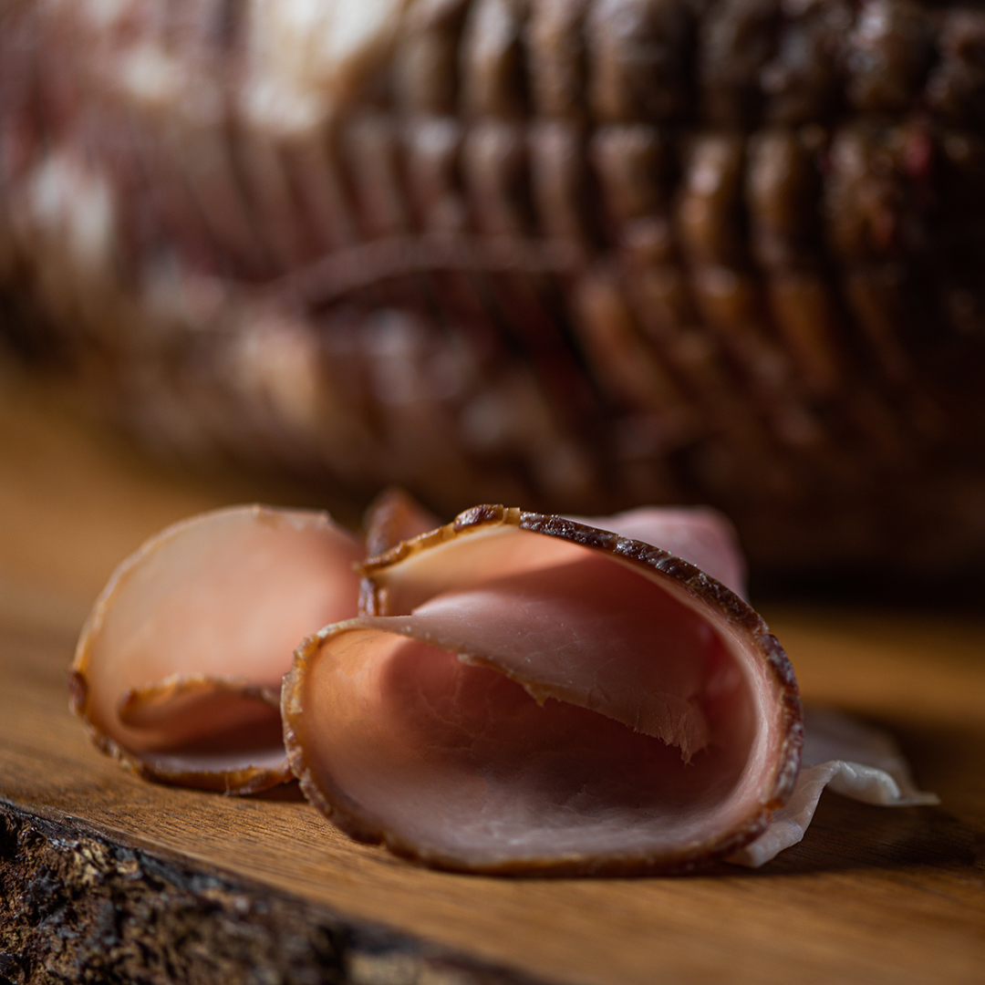 ΠΑΡΑΓΩΓΗ: Το κομμάτι κρέατος τοποθετείται σε άλμη για την επίτευξη του ομαλού αλατίσματός του. Ακολουθεί η αποστράγγιση του κομματιού, με την διαδικασία φυσικού στεγνώματος στον αέρα για μέρες. Το κομμάτι καπνίζεται επί ώρες, σε ξύλο της επιλογής μας.