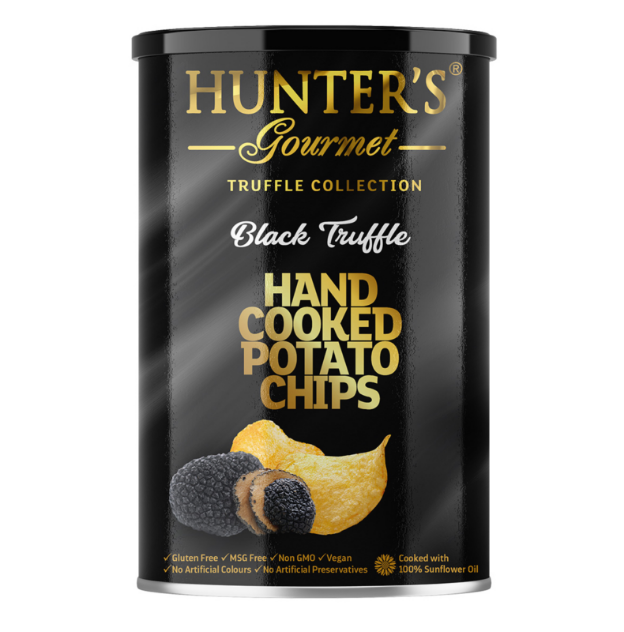 Hunter’s Gourmet Hand Cooked Potato Chips – Black Truffle – Truffle Collection (150gm) 150gm Canister. Potato Chips, Vegan, Gluten free, MSG Free, Non GMO, No Artificial Preservatives, No Artificial Colours, No Transfat, No Cholesterol, Halal, Dairy Free, Lactose Free.